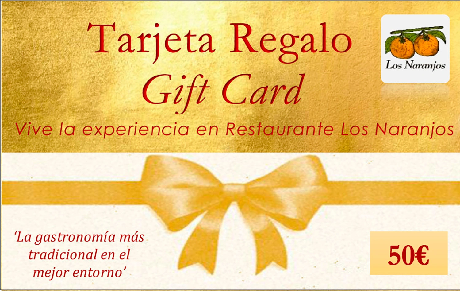 Regala una experiencia gastronómica con nuestra Tarjeta Regalo Los Naranjos valorada en 50 euros. Puedes comprar una, dos o las que necesites. A la venta en nuestro restaurante y también te la enviamos a casa en un original envoltorio.